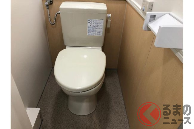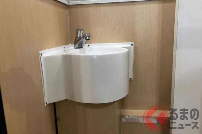 標準装備は、陶器製小便器、洋式の陶器製大便器、蛇口のある手洗い場、換気扇、室内灯に加えて、車外には格納式昇降ステップや手すりがあり、価格は600万円です。