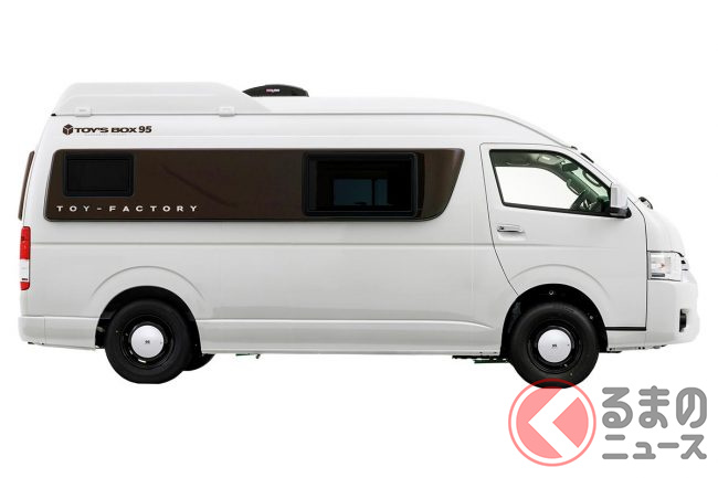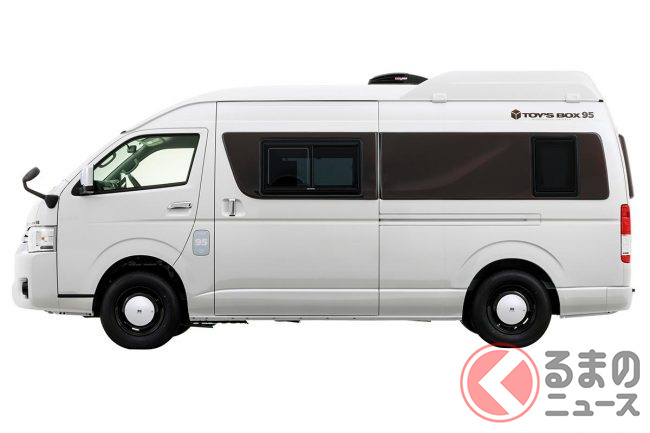 ベースとなる「TOY’S BOX」はトヨタ「ハイエース」(スーパーロング)を架装したキャンピングカーで、シンプルかつ広く使いやすい室内ファニチャーと、レジャーに使える積載性の高さが特徴。