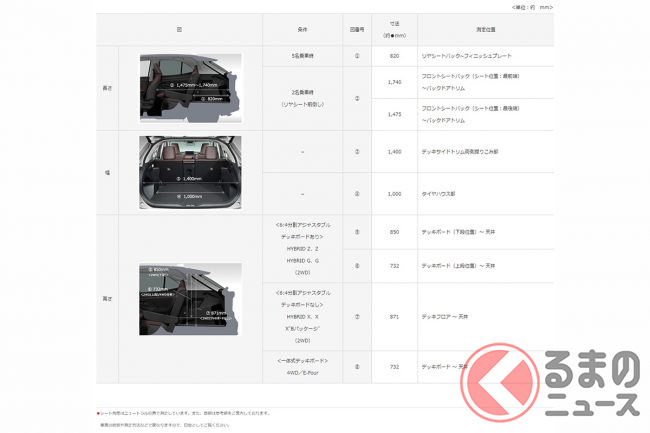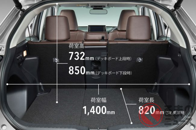 駆動方式やグレードにより異なりますが、荷室容量は5名の定員乗車時で最大約390リットル(トヨタ計測値、以下同)。リアシートを前倒しした際の最大荷室容量は約1102リットルと、十分な積載能力を誇ります。