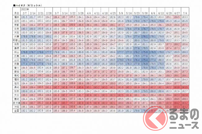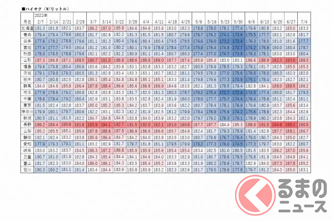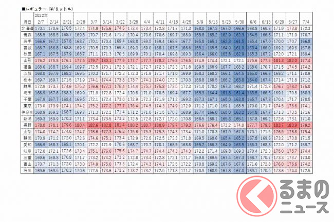 資源エネルギー庁は2022年7月6日、レギュラーガソリンの4日時点の店頭小売価格(消費税込)を発表しました。