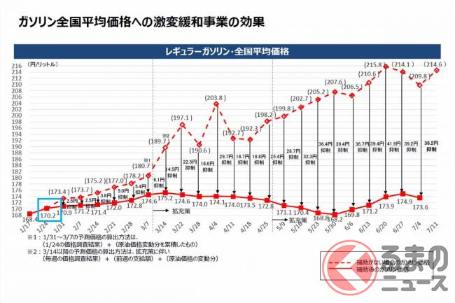 なお、経産省によると、補助金がない場合のレギュラーガソリンの全国平均小売価格は、7月4日時点で1リットル209.8円と算出しており、来週の11日時点では214.6円に上がると見ています。