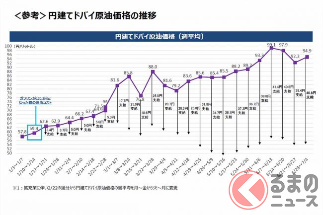 ガソリン価格の高騰を受け、政府は石油元売り企業に補助金を出す価格抑制策を実施。ガソリン、軽油、灯油、重油を対象に2022年1月27日から1リットルあたり5円、3月10日から25円を上限として支給しています。