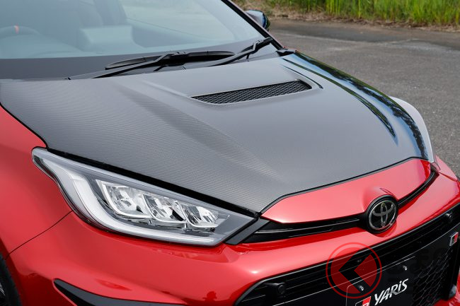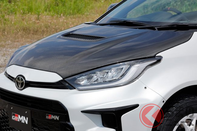 カーボンボンネットは、軽量化はもちろん、ダクトの追加による冷却効果アップも期待できます。GRMNヤリスはカーボン柄+クリア塗装のみとなっていますが、GRヤリス用は外面ボディ同色仕様も検討中といいます。