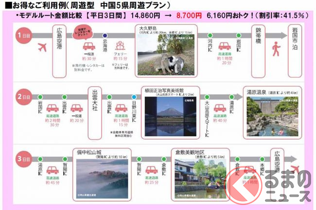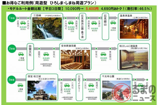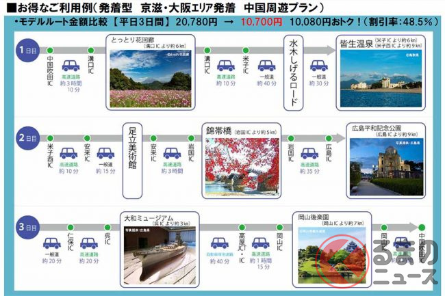 例えば「京滋・大阪エリア」の中国道・中国吹田ICを発着地として、とっとり花回廊や水木しげるロード、皆生温泉、足立美術館、錦帯橋、広島平和記念公園、大和ミュージアム、岡山後楽園を平日3日間、普通車で周遊する場合、通常の高速料金は2万780円ですが、パス利用なら48%引きの1万700円になるといいます。