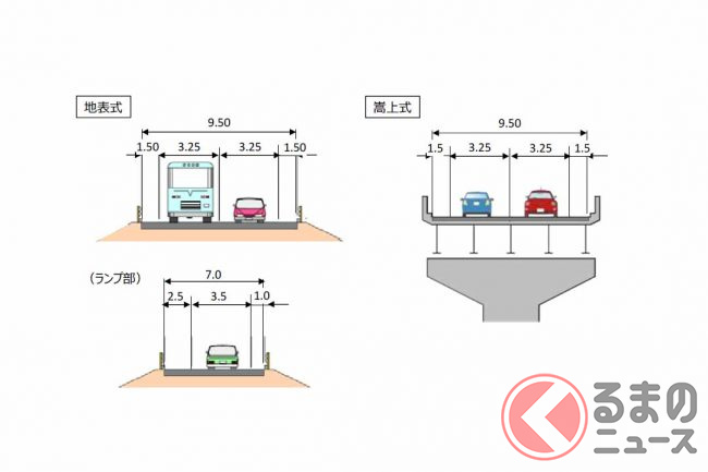 道路は2車線(片側1車線)で、約6割の区間は国道147号・148号などの現道を活用する形で整備されます。別線整備区間では、糸魚川市内の山本橋から北陸道・糸魚川IC間までの約7kmが市街地を迂回するルートで2019年度に新規事業化されました。