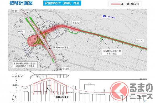 安曇野道路は、長野道に新設する安曇野北IC(仮称、安曇野市豊科光)から安曇橋北側(同市穂高北穂高)までの延長4.0kmが計画されています。