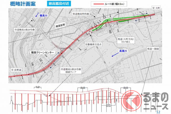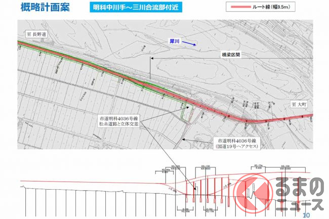 安曇橋北側から先は既存の長野県道306号(高瀬川右岸道路)に接続し、大町市の市街地までの区間は追越車線の設置や交差点の立体化といった部分的な改良がおこなわれる方針です。