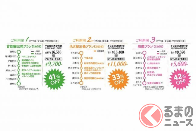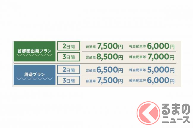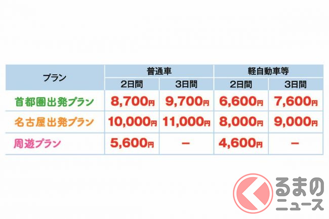 価格は、周遊プランが普通車5600円、軽自動車等4600円。首都圏出発プランが普通車8700円から、軽自動車等6600円から、名古屋出発プランが普通車1万円から、軽自動車等8000円からです。