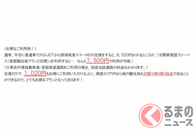 例えば、東北道の川口JCTから那須高原スマートICまでを平日に普通車で往復すると8520円かかりますが、首都圏出発プラン2日間のパスだと7500円となり、往復だけで元が取れます。