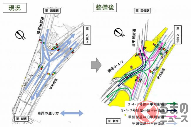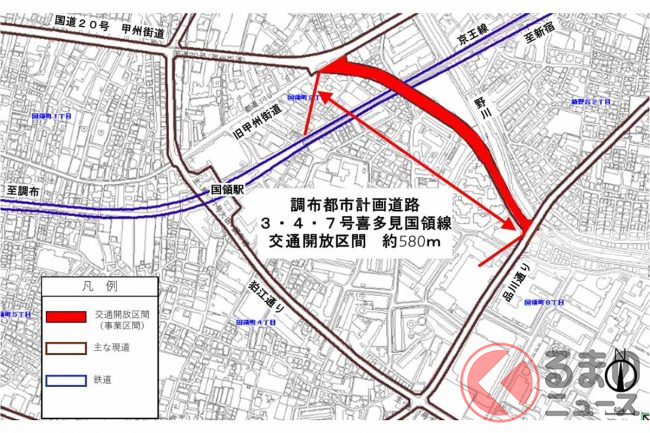 同局によると、開通により国領駅前を通る狛江通りの交通渋滞が緩和されるとともに、住宅地などの狭い道に流入する通過交通が減るなど、周辺地域の安全性や快適性の向上が図られるといいます。
