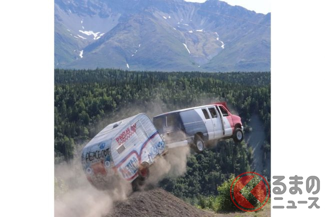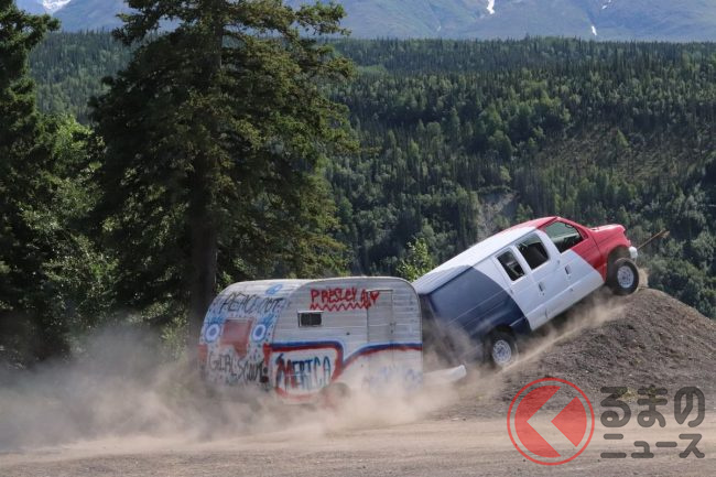 飛び降りるクルマは、レクサスやジャガー、ジープ、シボレーのバンやセダン、SUVなど様々ですが、なかにはキャンピングトレーラーを曳いたまま飛び降りるクルマもいます。