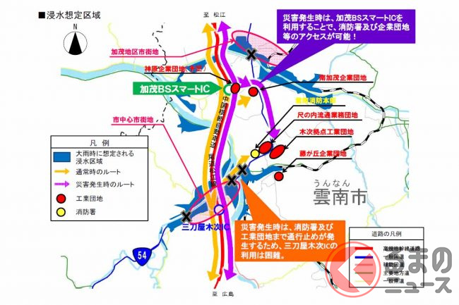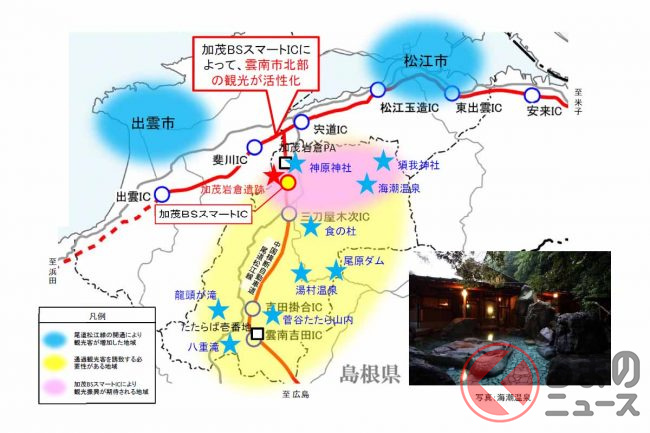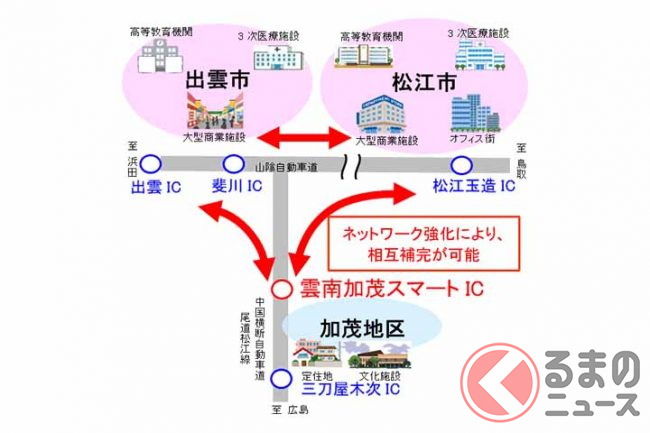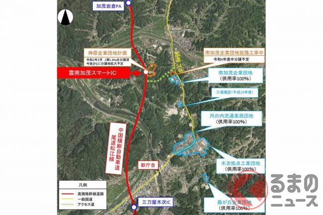 雲南市とNEXCO西日本によると、スマートICの整備によって、直結する神原企業団地や周辺の団地への企業誘致促進、既存の企業団地から物流効率化など、産業活動の活性化が期待されるといいます。