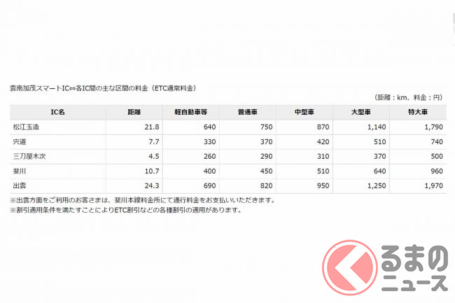 雲南加茂スマートICまでの通行料金(普通車、ETC通常料金)は、松江玉造ICから750円、宍道ICから370円、三刀屋木次ICから290円、斐川ICから450円、出雲ICから820円です。