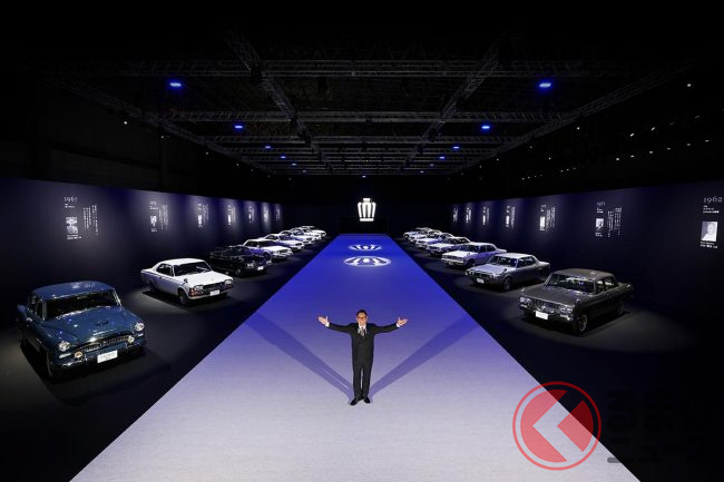 会場の入口には、1955(昭和30)年に本格国産乗用車の先駆けとして誕生した初代クラウンから、2018年に登場した現行型(15代目)クラウンに至る歴代モデルが一堂に会し、来場者を圧倒させます。