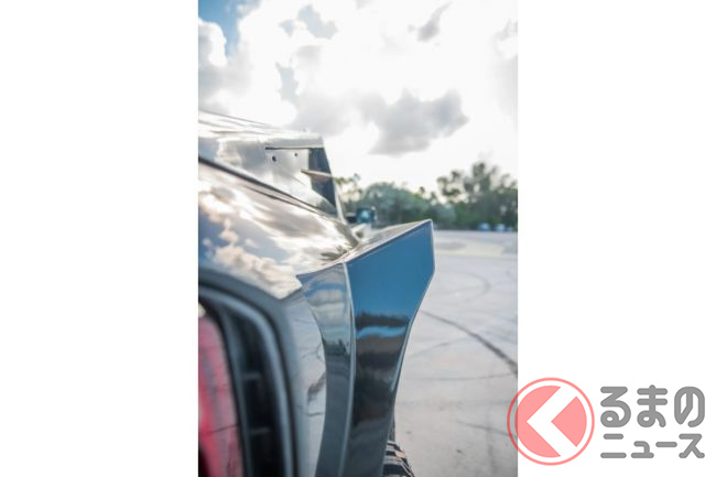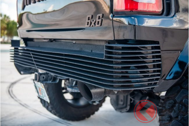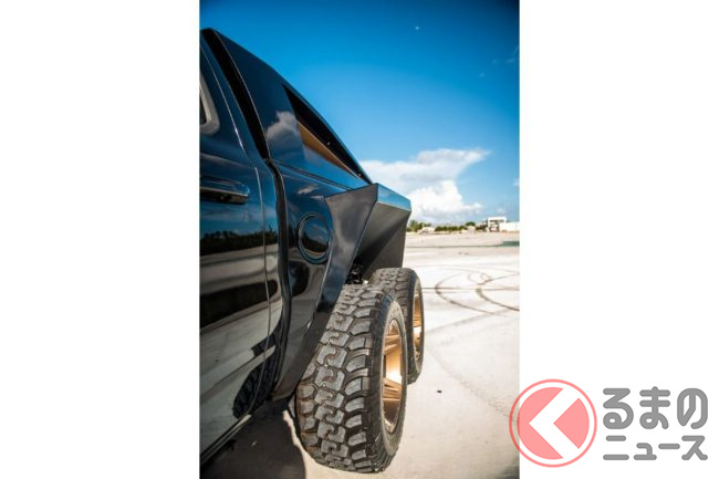 エクステリアでは、6輪化だけでなく、フロント・リアのエアロパーツやド派手なオーバーフェンダーなど、ベース車の造形がわからなくなるほどの大胆なカスタマイズが施されています。