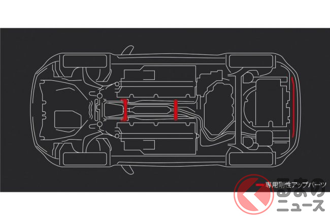 専用剛性アップパーツとして、フロア下とロアバックにブレースを追加。操縦安定性の向上とフラットな乗り心地に寄与しています。