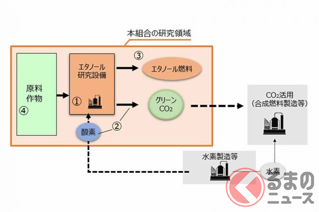 今回設立された研究組合はバイオエタノール燃料に着目し、バイオマスの利用や、生産時の水素・酸素・CO2を最適に循環させて効率的に自動車用燃料を製造する技術研究に取り組みます。
