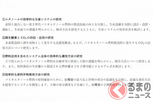 具体的には、エタノールの効率的な生産システムの研究、水素製造時に副生成物として発生する高濃度酸素やバイオエタノール燃料製造時に発生するCO2の回収・活用の研究、バイオエタノール燃料を自動車などに使用した際の課題と解決方法の研究、原料栽培の生産量から製造される燃料量までを予測可能とするモデル式の検討、効率的な原料作物栽培方法の研究などです。