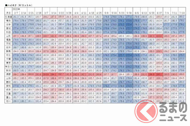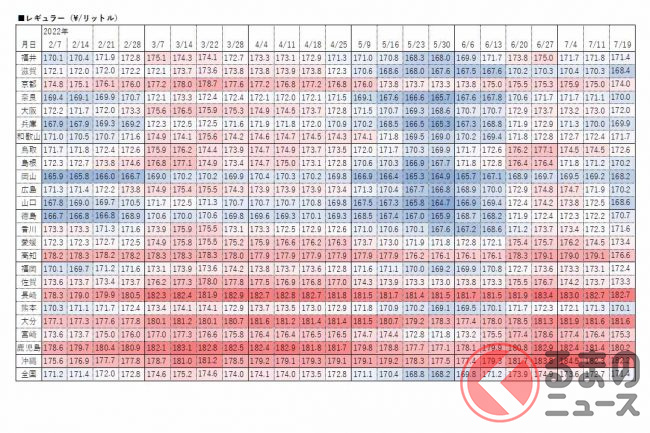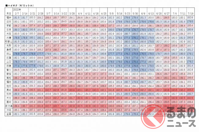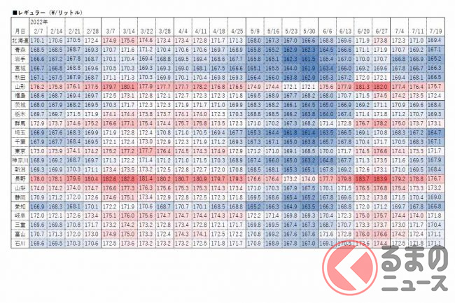 資源エネルギー庁は2022年7月21日、レギュラーガソリンの19日時点の店頭小売価格(消費税込)を発表しました。