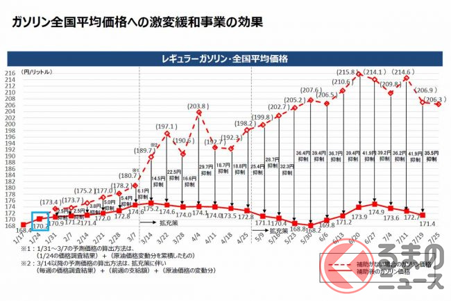 補助金なければ200円超え! 全国レギュラー平均171.4円 ガソリン3週連続値下がりするも補助金は明日から減額