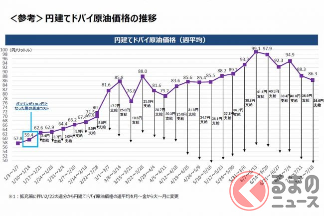 ガソリン価格の高騰を受け、政府は石油元売り企業に補助金を出す価格抑制策を実施。ガソリン、軽油、灯油、重油を対象に2022年1月27日から1リットルあたり5円、3月10日から25円を上限として支給しています。