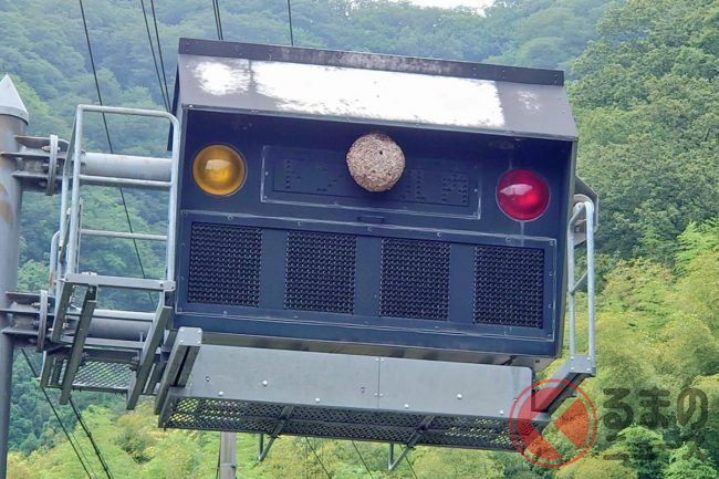 道路情報板には、上部に赤と黄色のランプが取り付けられている場合がありますが、投稿された写真を見るとランプと同じ並びのちょうど真ん中にライトを超えるほどの大きな蜂の巣があることが分かります。