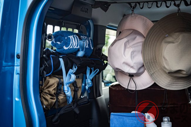 また、車中泊をするには十分な広さとはいえない室内空間を有効に活用するため、リアの窓にラックを付けて収納スペースを確保し、アウトドアでの必要最低限のテーブル、三脚、グランドシートなどの装備は常に車載しているといいます。