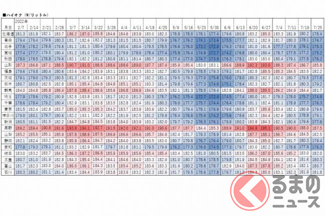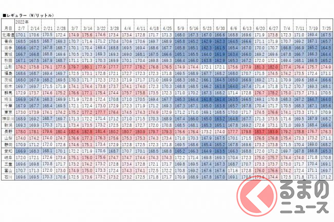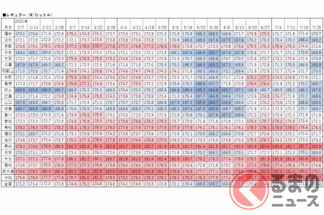資源エネルギー庁は2022年7月27日、レギュラーガソリンの25日時点の店頭小売価格(消費税込)を発表しました。