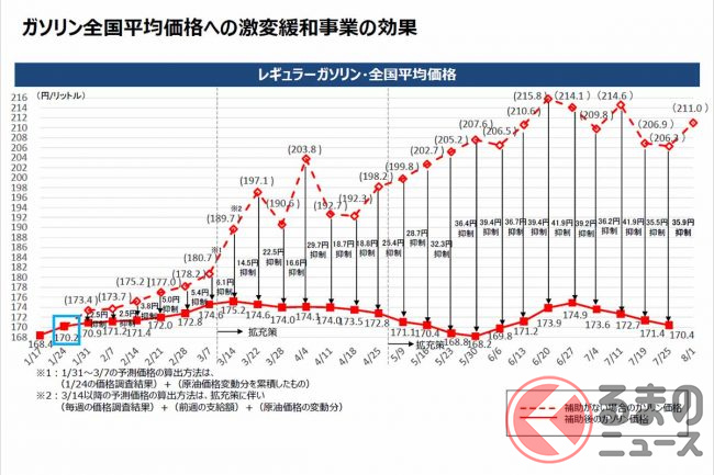 なお、経産省によると、補助金がない場合のレギュラーガソリンの全国平均小売価格は、7月25日時点で1リットル206.3円と算出しており、来週の8月1日時点では211.0円に上がると見ています。