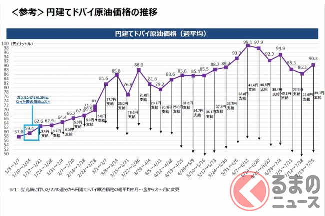 ガソリン価格の高騰を受け、政府は石油元売り企業に補助金を出す価格抑制策を実施。ガソリン、軽油、灯油、重油を対象に2022年1月27日から1リットルあたり5円、3月10日から25円を上限として支給しています。