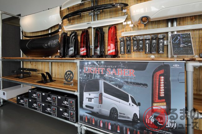 店内には棚やルーフキャリアなど人気の架装工事を盛り込んだ架装デモカーや、ハイエースのドレスアップに応えるカスタマイズ製品を展示。