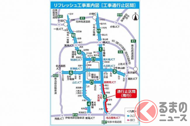 名古屋高速3号大高線南行きが、リフレッシュ工事に伴い10日間通行止めになります。迂回ルートは混雑が予想されており、注意が必要です。