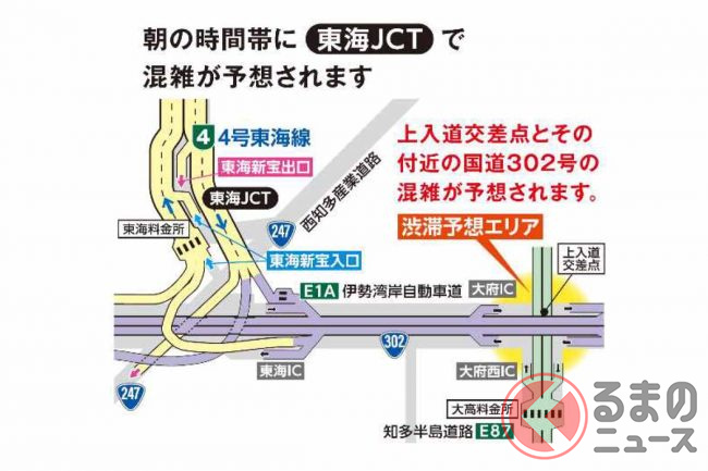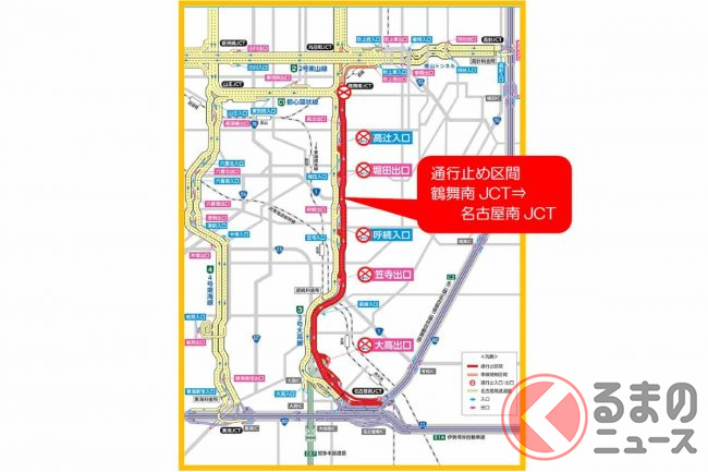 なお、期間中の影響としては、朝夕の時間帯に鶴舞南JCT付近で、朝の時間帯に東海線南行きの東海JCT(大府IC方面)や国道302号の上入道交差点(愛知県大府市)などで、それぞれ混雑が予想されるということです。