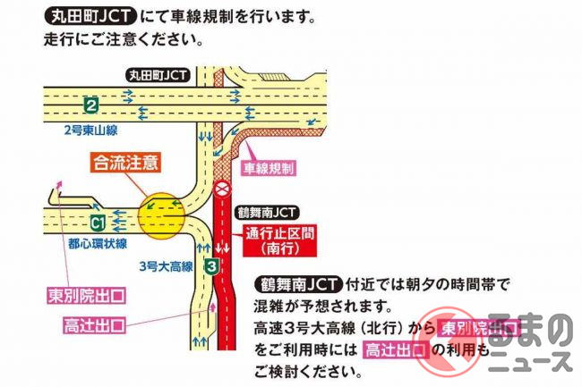 また、丸田町JCTでは、2号東山線から都心環状線への連絡路などで車線が減らされます。