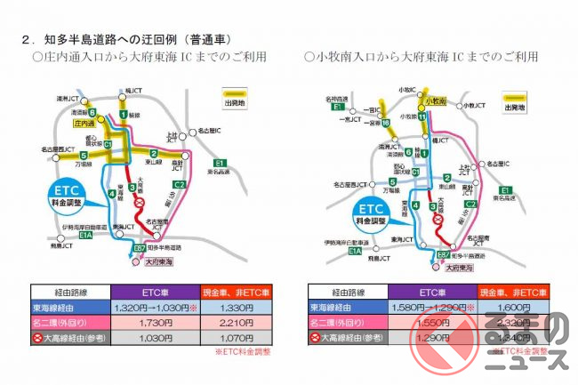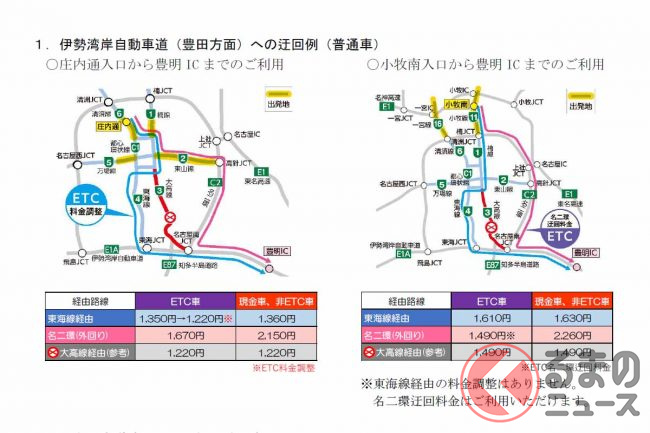 なお、ETC車の場合、迂回ルートの一部では、大高線経由より高くならないよう料金調整が実施されます(対象の入口やルートなどの条件あり)。