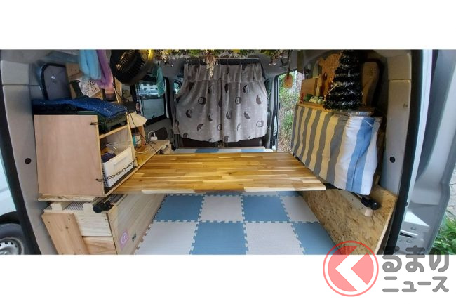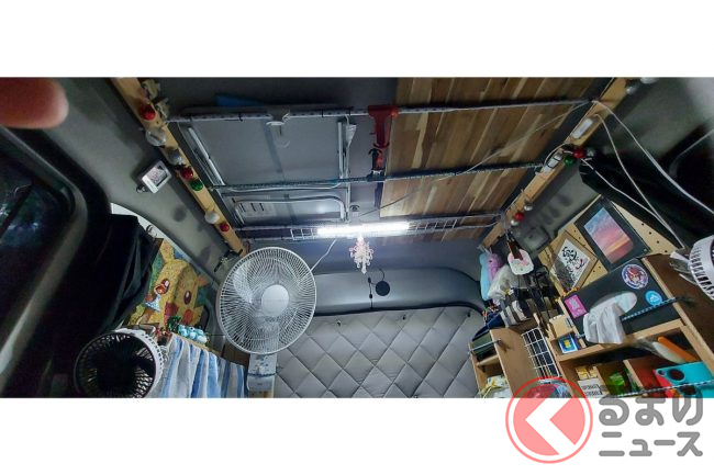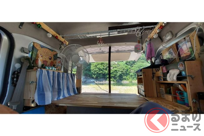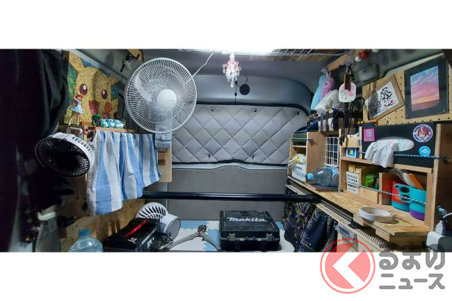さらには、扇風機を壁掛け式のようなかたちで設置していたり、百均で購入した日除けをリアハッチにぶら下げたり、夏の暑さ対策という観点からも機能性はバッチリなようです。