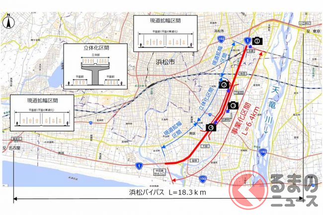 今回の事業対象区間となるのは、このうち長鶴交差点(浜松市東区)から中田島砂丘入口交差点(同・南区)までの延長6.4kmです。