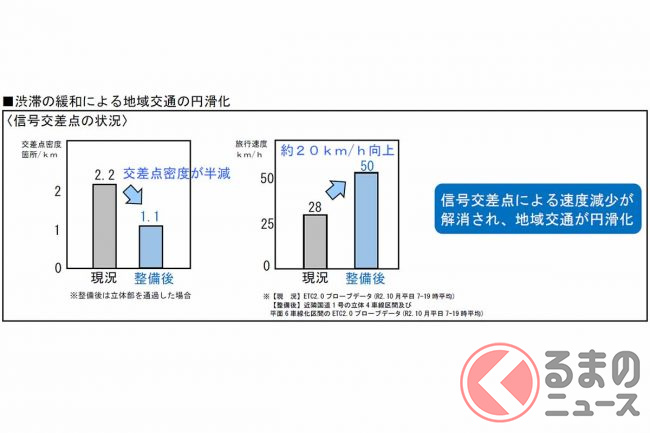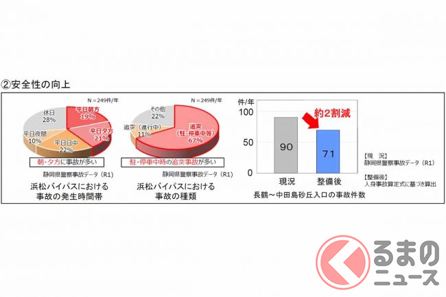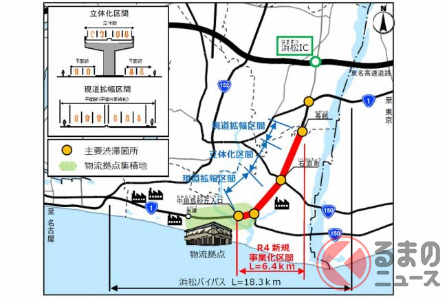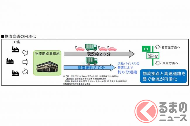 浜松河川国道事務所によると、この改良により事業区間の旅行速度は28km/hから50km/hに上がり、浜松市南部にある物流拠点の米津から東名・浜松ICまでの所要時間は現在の約26分から、整備後は約20分に短縮される見込みといいます。