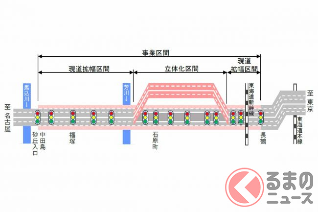 今回の事業は、4車線(片側2車線)の現道を6車線に拡幅するとともに、途中区間に2.6kmの陸橋を架けて、国道150号と交わる石原町交差点など6か所の信号交差点を一気にオーバーパスできるようにするものです。