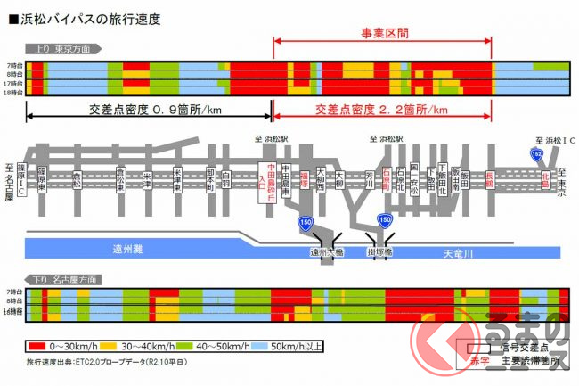 旅行速度(ETC2.0プローブデータ、2020年10月平日平均)を比較すると、信号のない磐田バイパスは62km/h、浜名バイパスは77km/hですが、浜松バイパスの事業区間外は43km/h、信号交差点が連続する浜松バイパスの事業区間は28km/hと著しい低下がみられます。