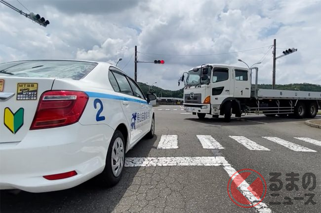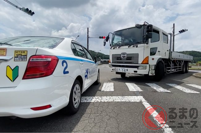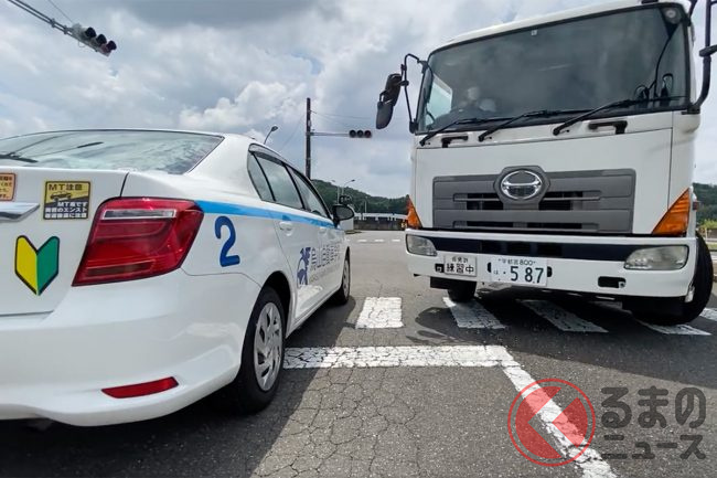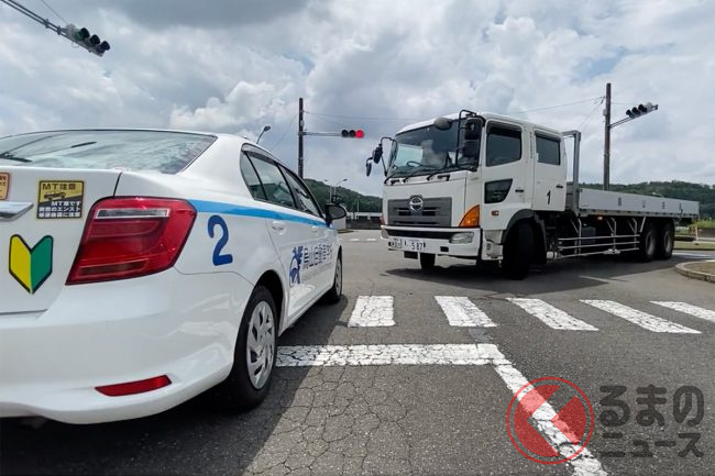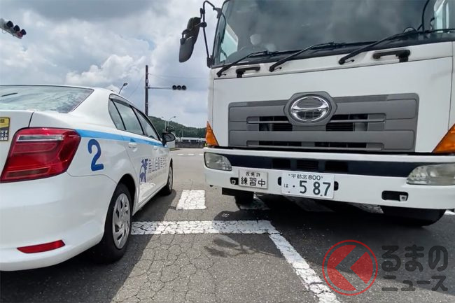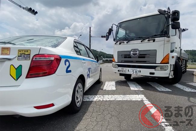 しかし、教習車が停止位置を過ぎて停まっていることから、トラックとぶつかりそうになっていることが分かります。