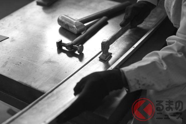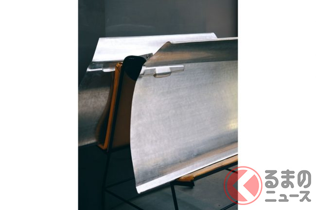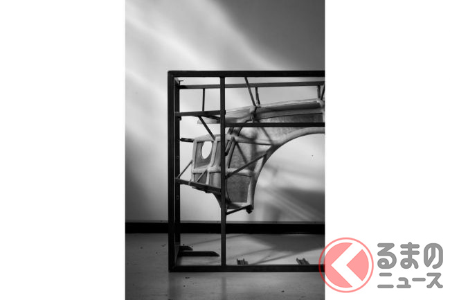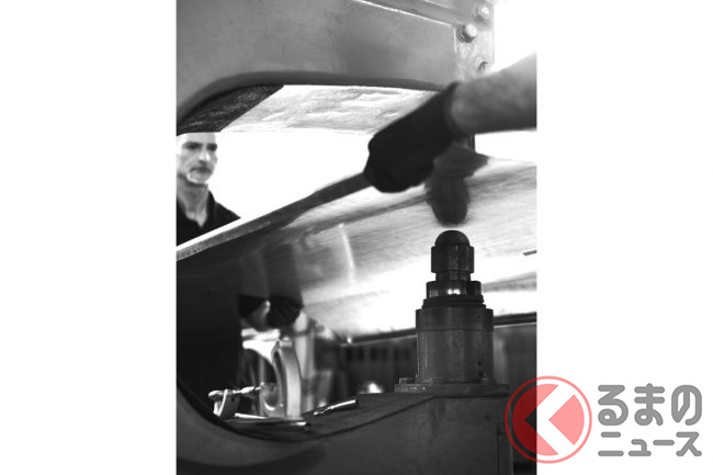 クルマを構成するほとんどの要素が手作りで作られていて、ボデイパネルはアルミニウムの一枚板をハンマーなどで形成しています。