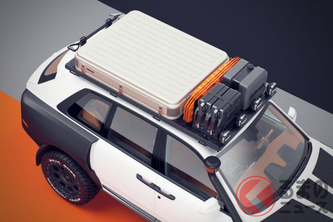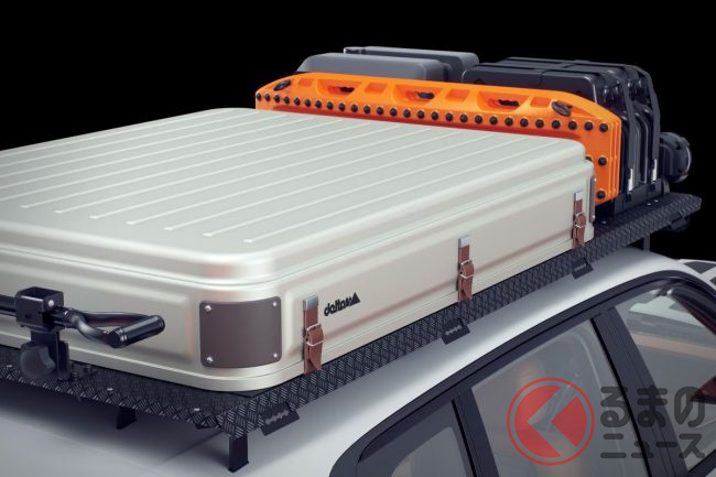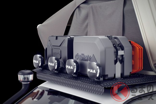 追加で取り付けられたブルバーとルーフに設置されたルーフキャリアには、PIAAのラリーライトが増設、キャリアの上にはシャベルやボックス、ルーフテントが設置されています。