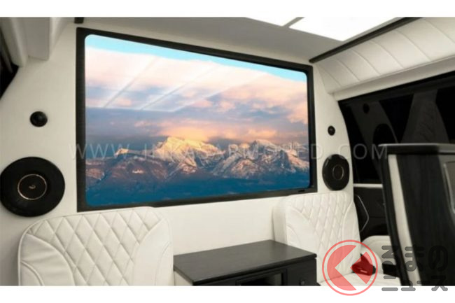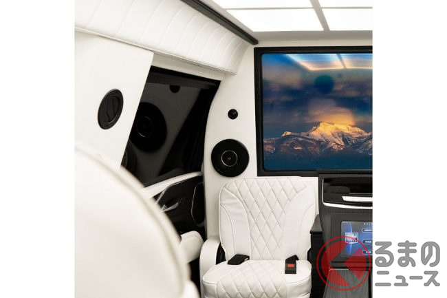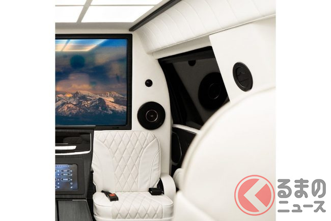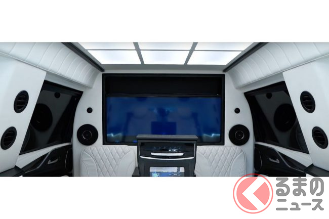 また運転席と後部座席を隔てるパーテーションは開閉が可能で、大きなモニターが埋め込まれています。これらの電装品は、最後尾の座席の真ん中に埋め込まれたコンソールから座席に座ったまま操作することが可能です。