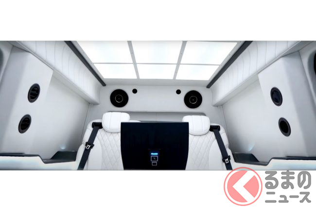 広くなった後部キャビンは、温度調節やマッサージシステムを内蔵したキャプテンシートや自然光を模した革新的な天井のライティング、電動折りたたみテーブルやジャンプシートなどが装備されていて、まさに応接室といった内装になっています。