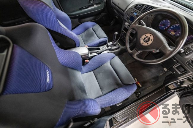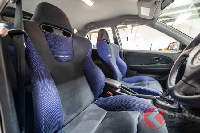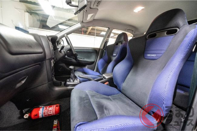 インテリアでは、シートに黒いスエードと青いファブリックを組み合わせたレカロのシートが採用されているほか、MOMOのステアリングホイール、ラリーアートのメーター、ラリーアートのフロントフロアマットなど工場出荷状態のまま残されています。