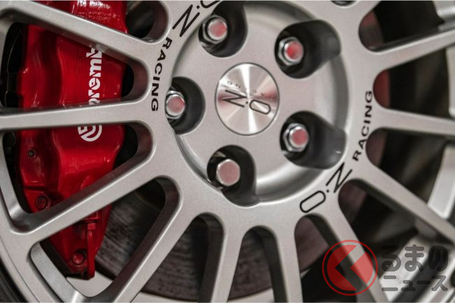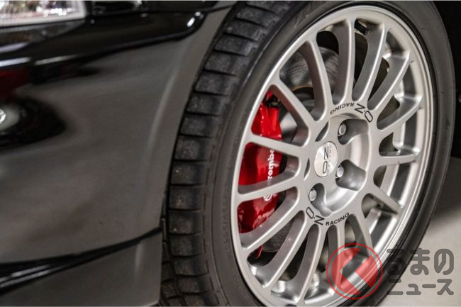 外装色はブラック、足元には、OZ Racingのアロイホイールに、赤いブレンボキャリパーがおさまり、タイヤにはブリヂストンの「Potenza S001」を履いています。