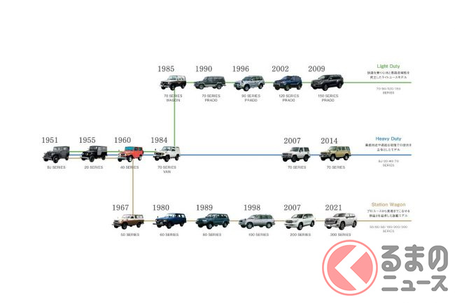 ランドクルーザーの3ドアモデルは、源流を同じくするトヨタ「ランドクルーザープラド」には長く存在したものの、現行モデルである300系ランドクルーザーに連なるモデルには1960年に発売された40系ランドクルーザー以来存在しません(派生モデルである70系ランドクルーザーには3ドアモデルがあります)。