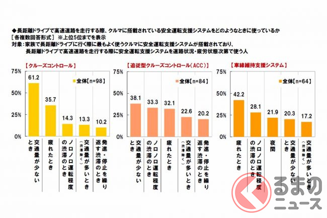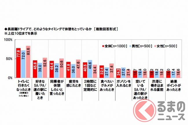 一方で女性は、「トイレに行きたくなったとき」(83.6%)や「好きなSA/PA/道の駅に着いたとき」(52.6%)が男性(順に72.0%、39.0%)と比べ10ポイント以上高くなりました。
