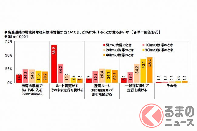一方で20km・30km・40kmでは「一般道に降りて走行を続ける」が最多(順に34.2%、43.1%、46.4%)となっています。